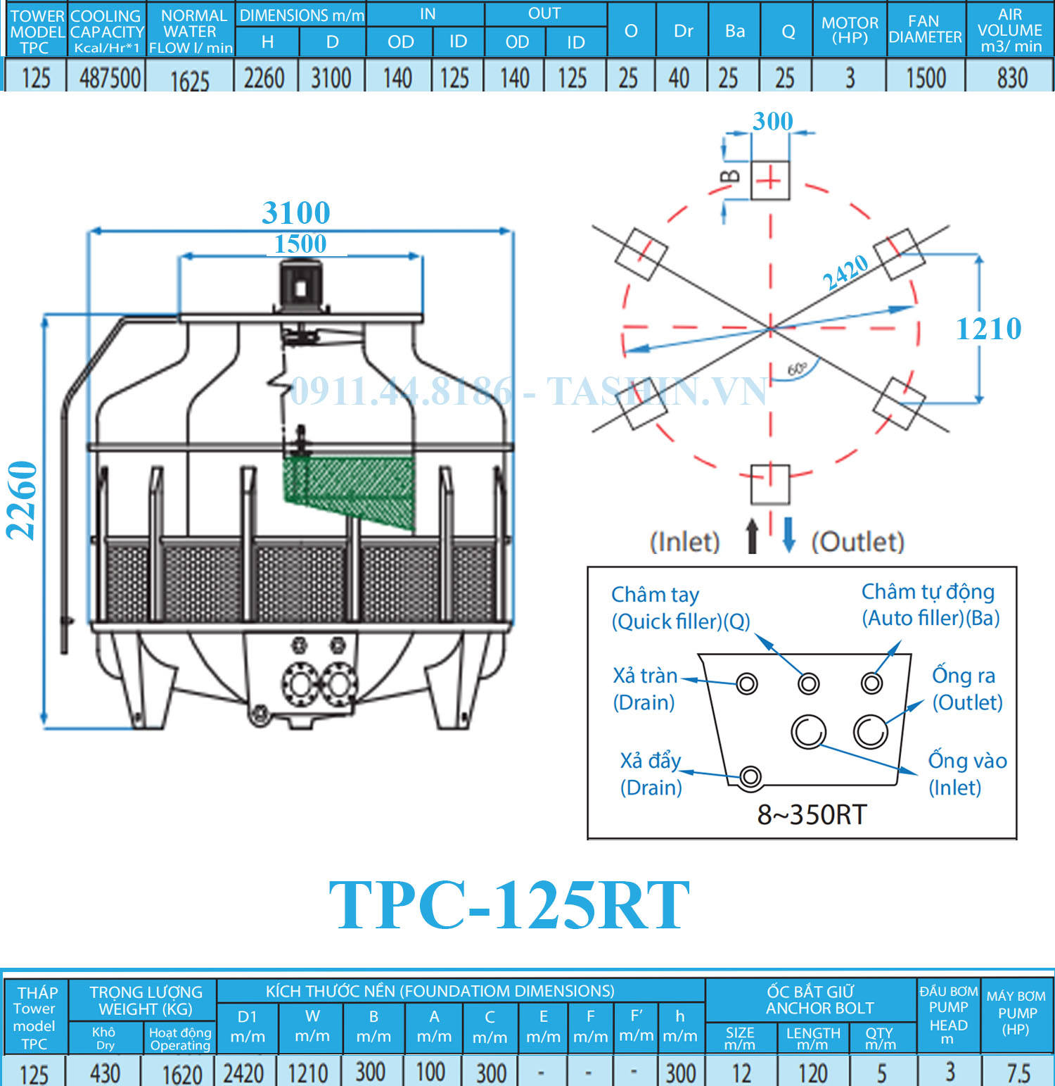 Thông số kĩ thuật tháp giải nhiệt TPC 125RT